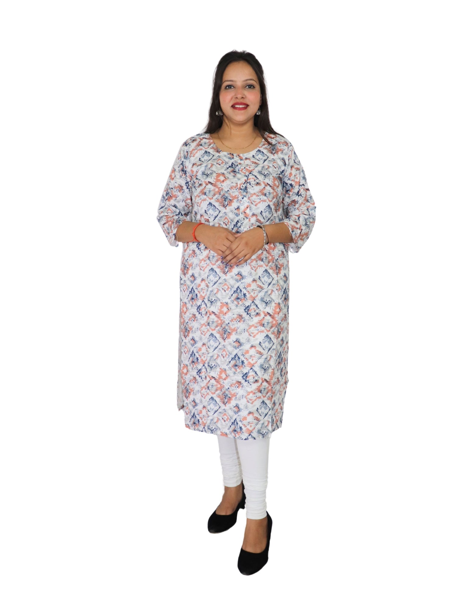 Regular price Rs. 525.00Regular priceRs. 999.00Sale price Rs. 525.00Women's Cotton Kurti with Geometric Print, 3/4 Sleeve, Casual Wear